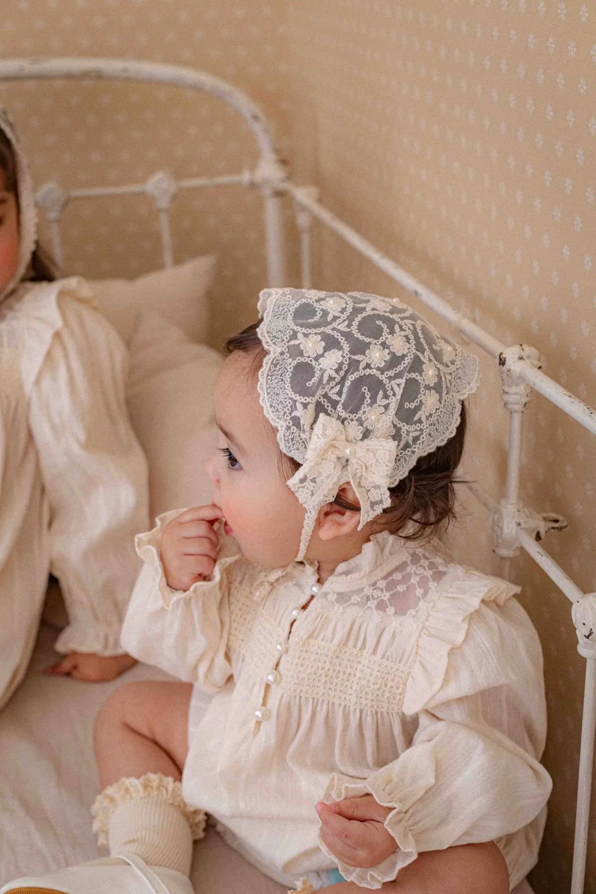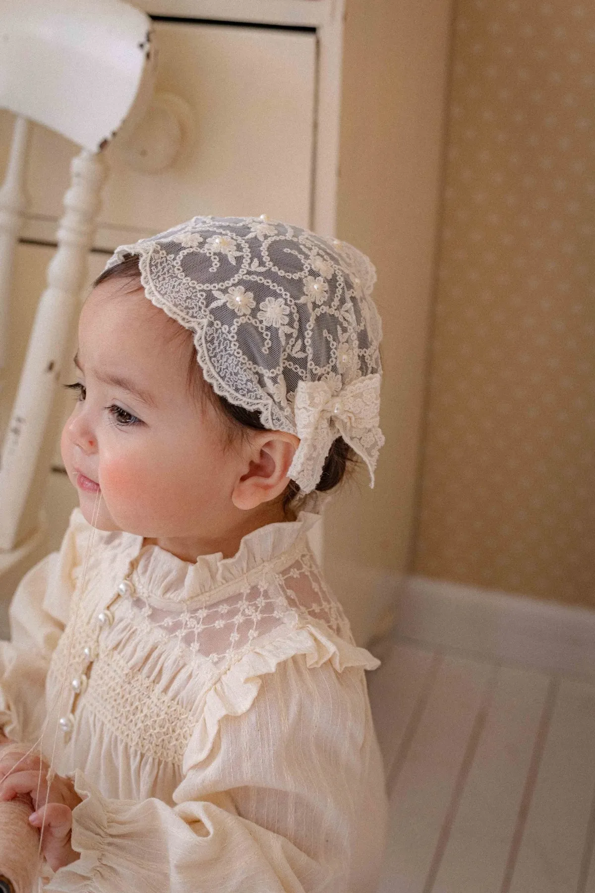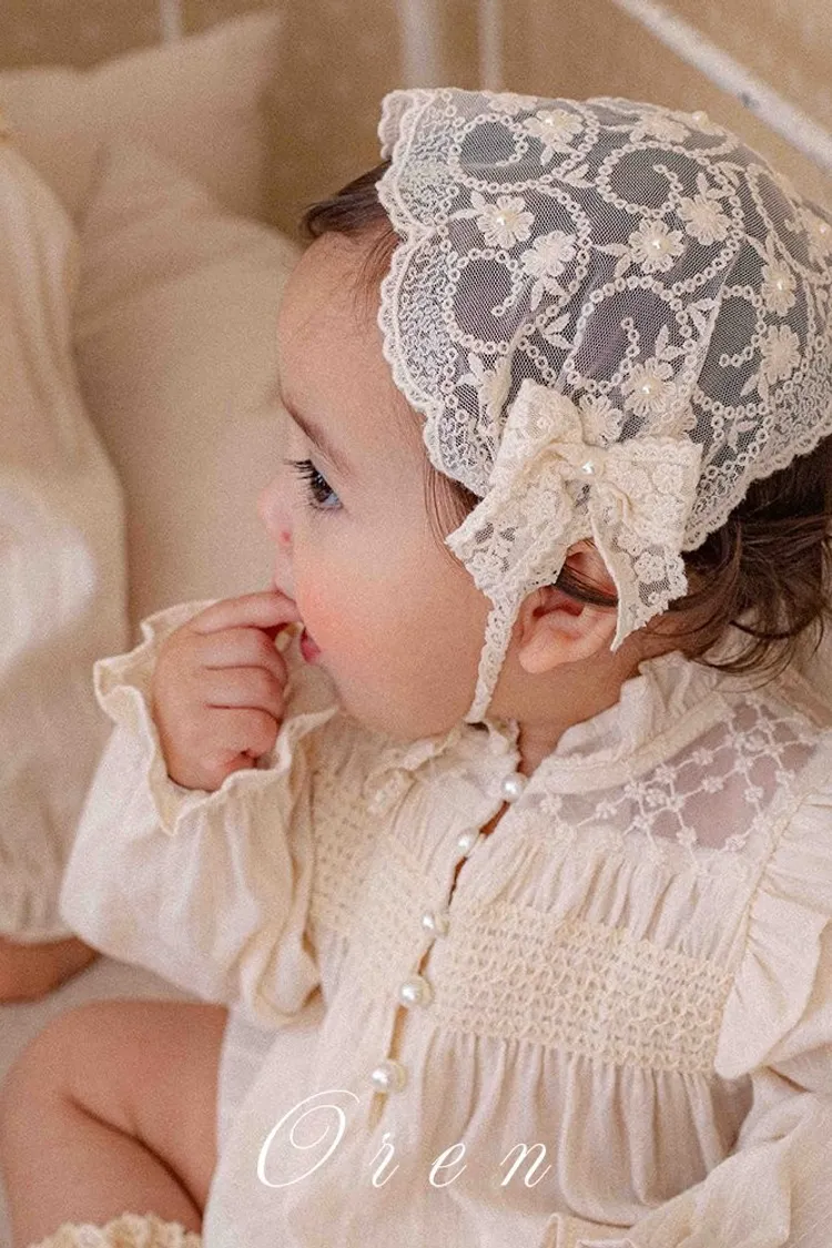 Oren蕾絲雙蝴蝶結珠珠寬髮帶