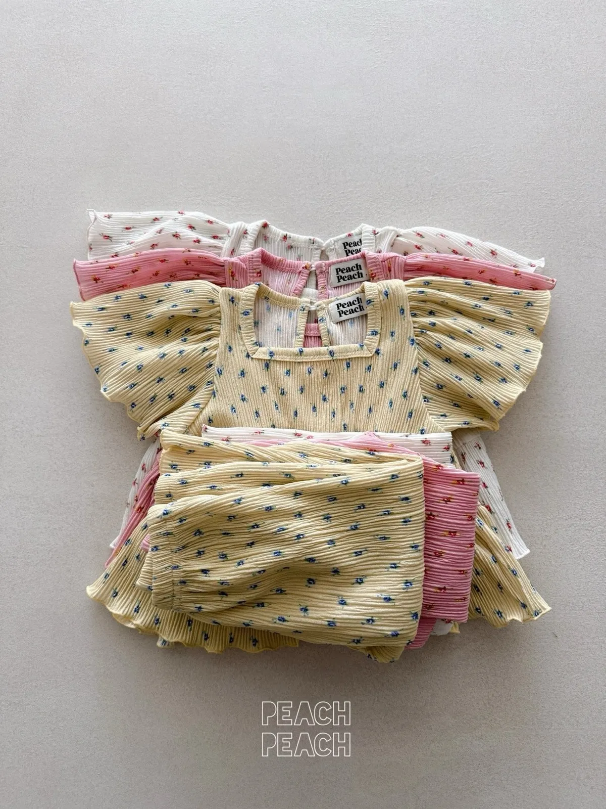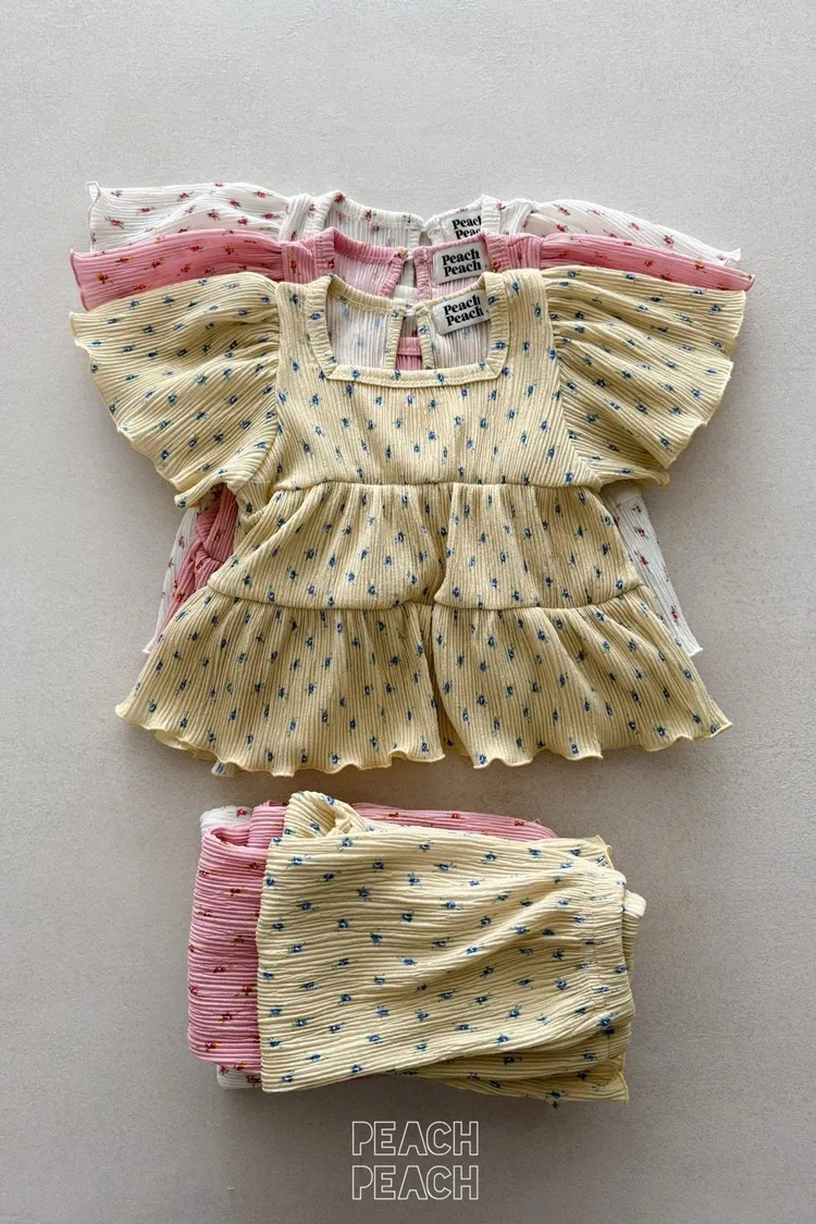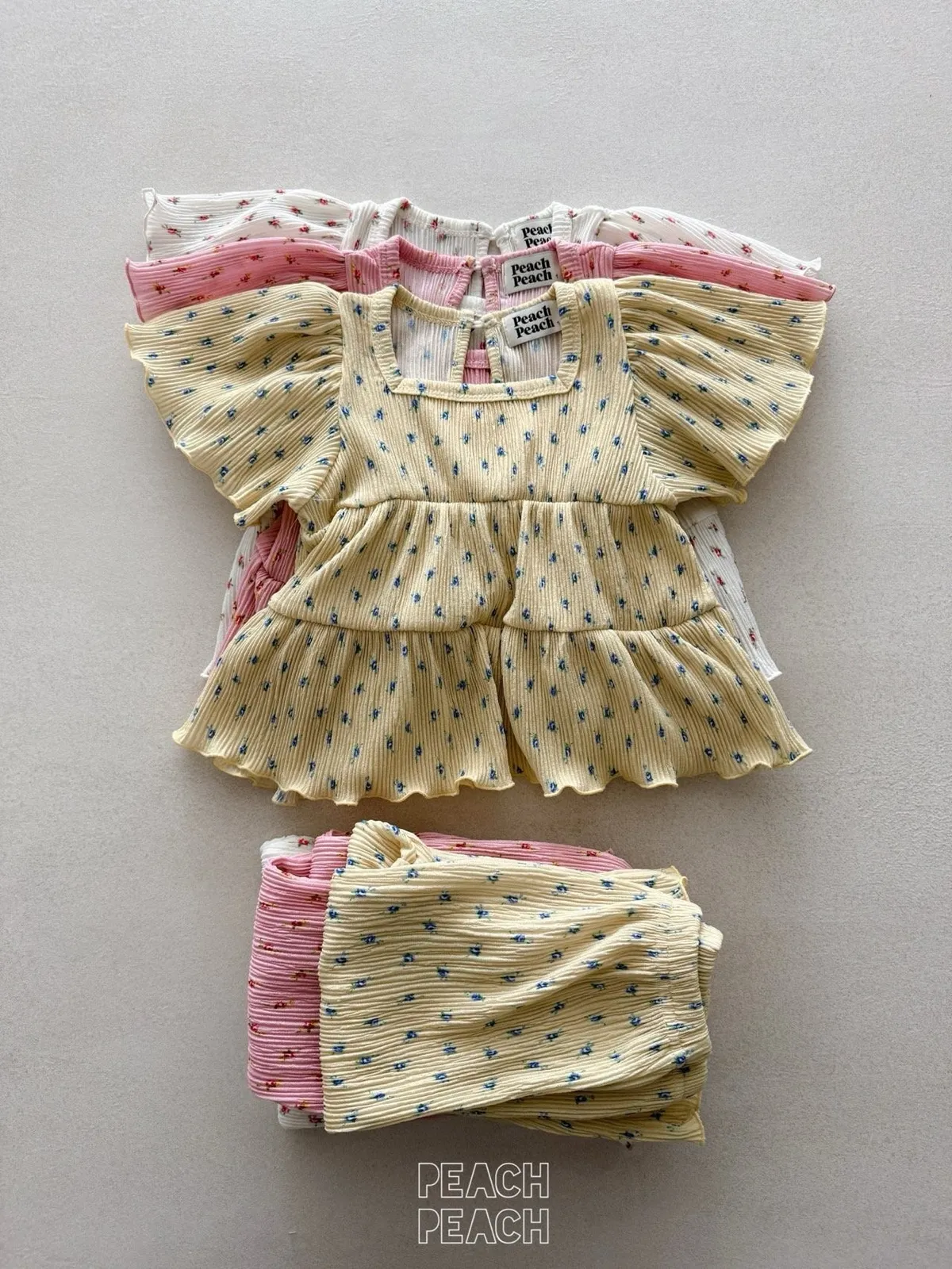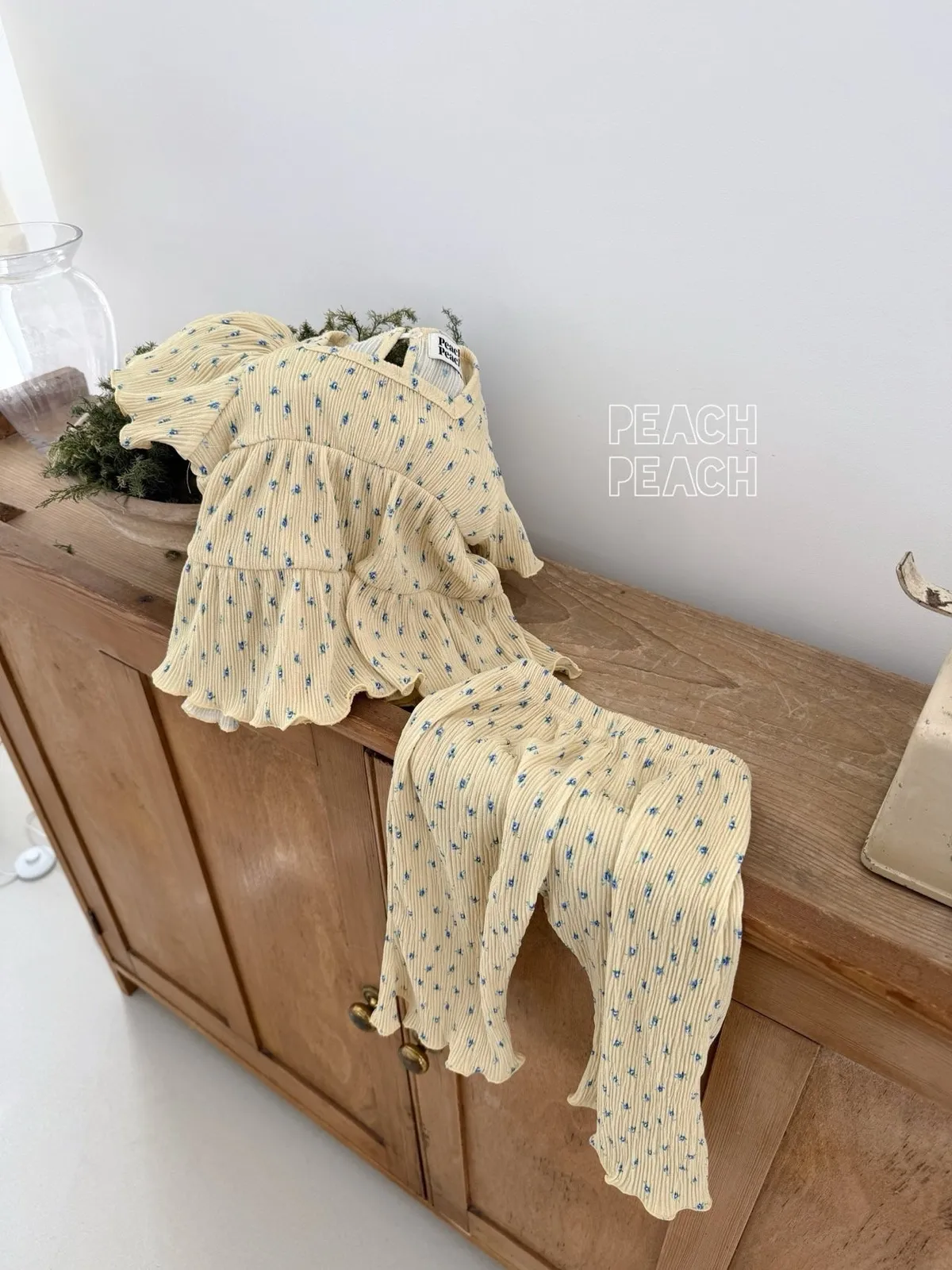 peach peach 2026 s u m m e r 🤍 - 코코 플리츠 세트 - 옐로우, 핑크, 아이 지난 시즌 멜로디 세트가 이번 시즌에는 잔잔한 플라워 패턴 플리츠 소재로 출시되었어요 :) 블라우스와 팬츠 모두 사랑스러움을 가득 담고 있어요! 컬러감은 또 세가지 모두 어찌나 예쁜지^^ 여름 내내 시원하게 입혀주세요💛💕🤍