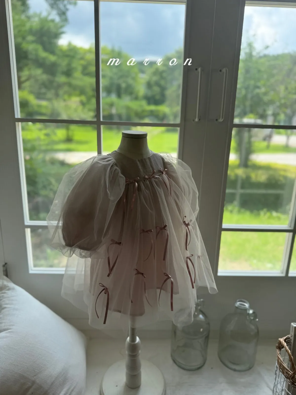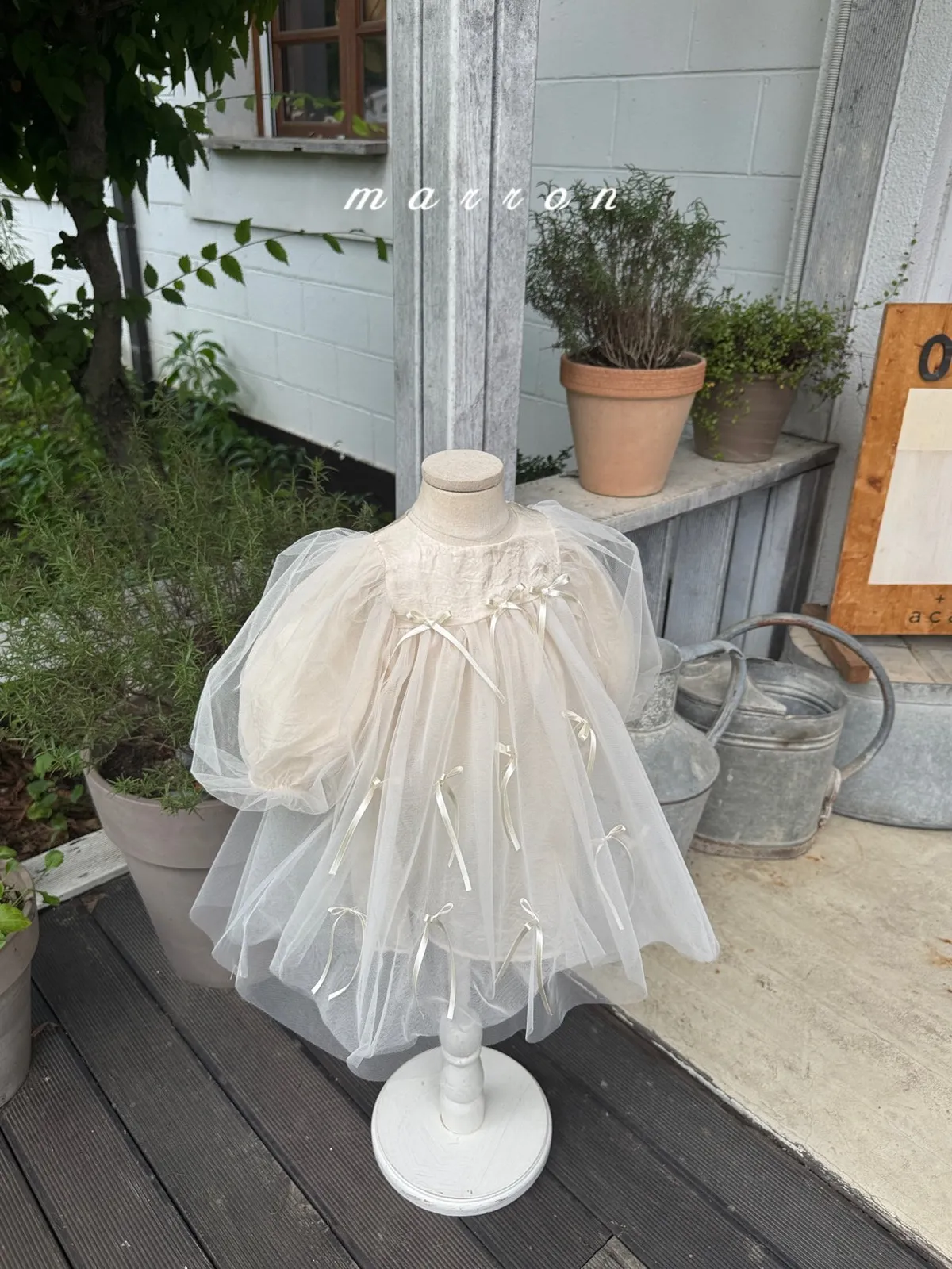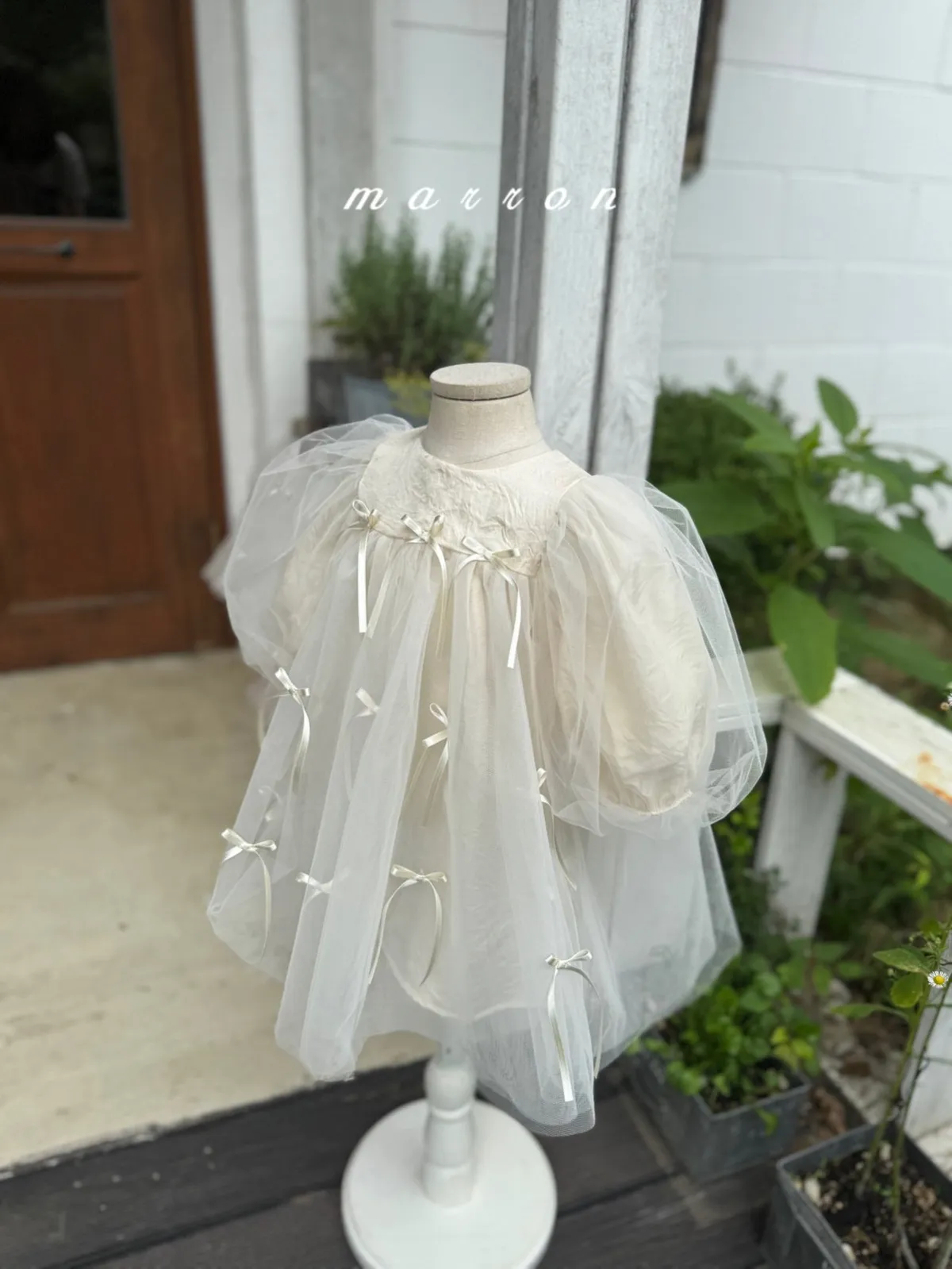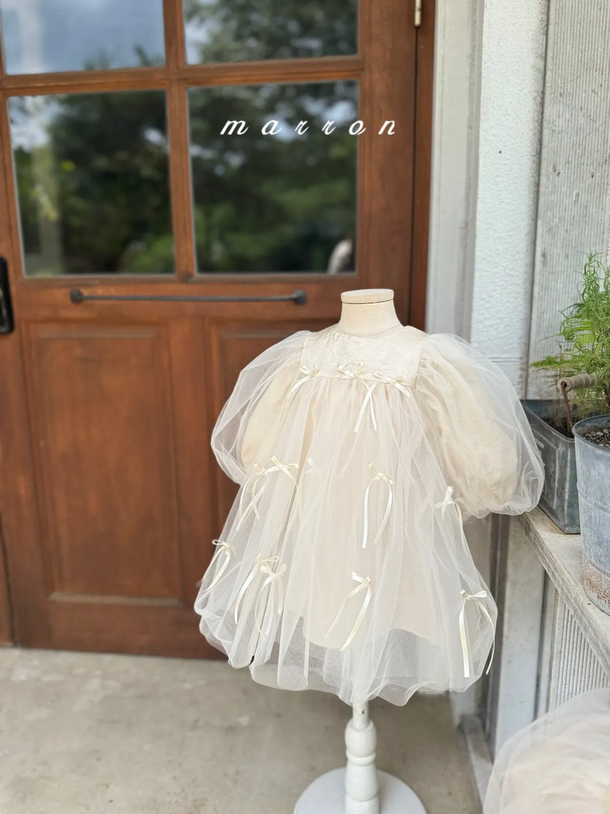 Marron 蝴蝶結澎澎袖連身紗裙
