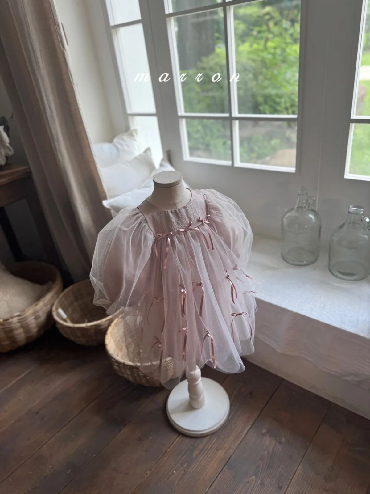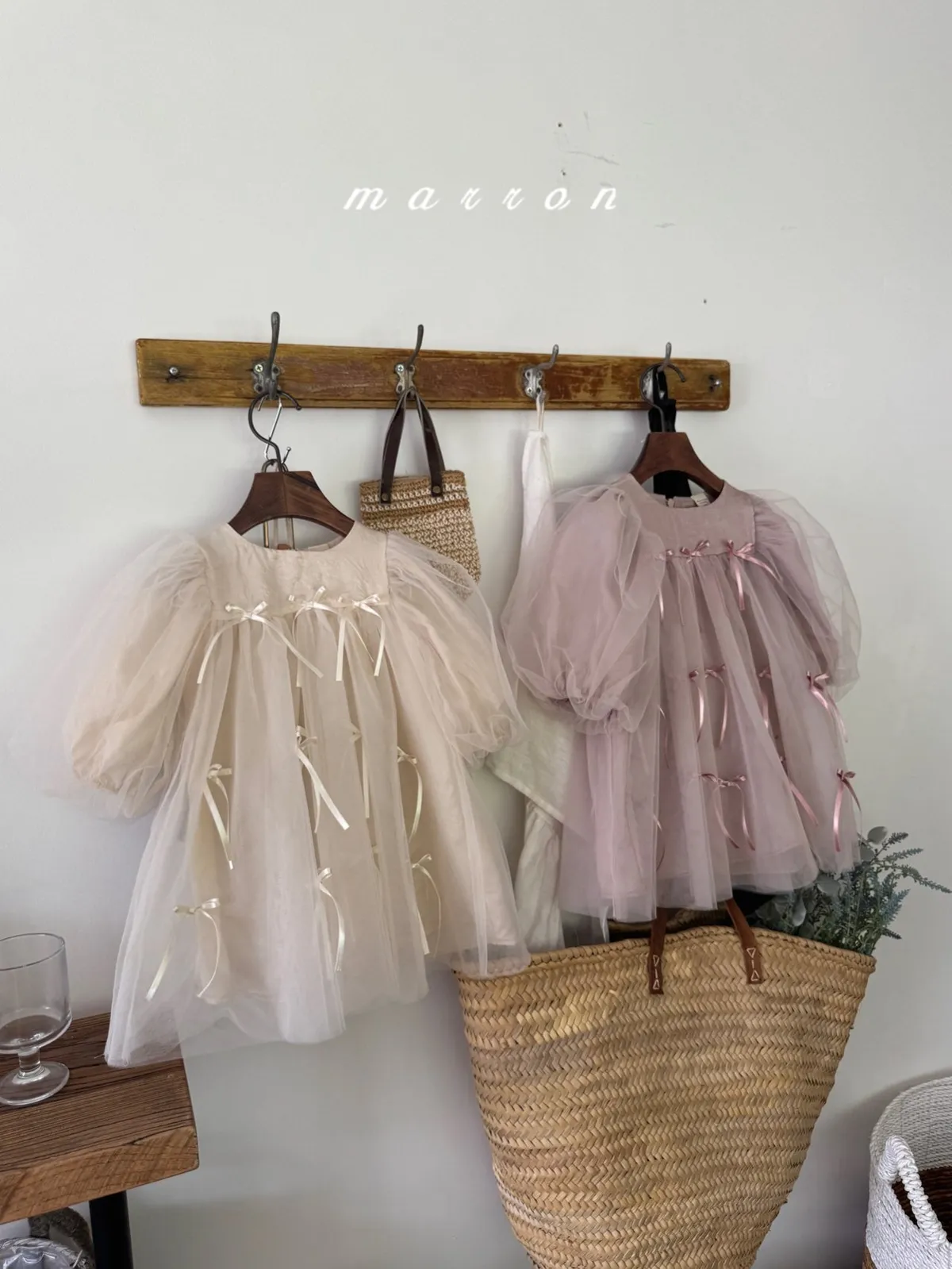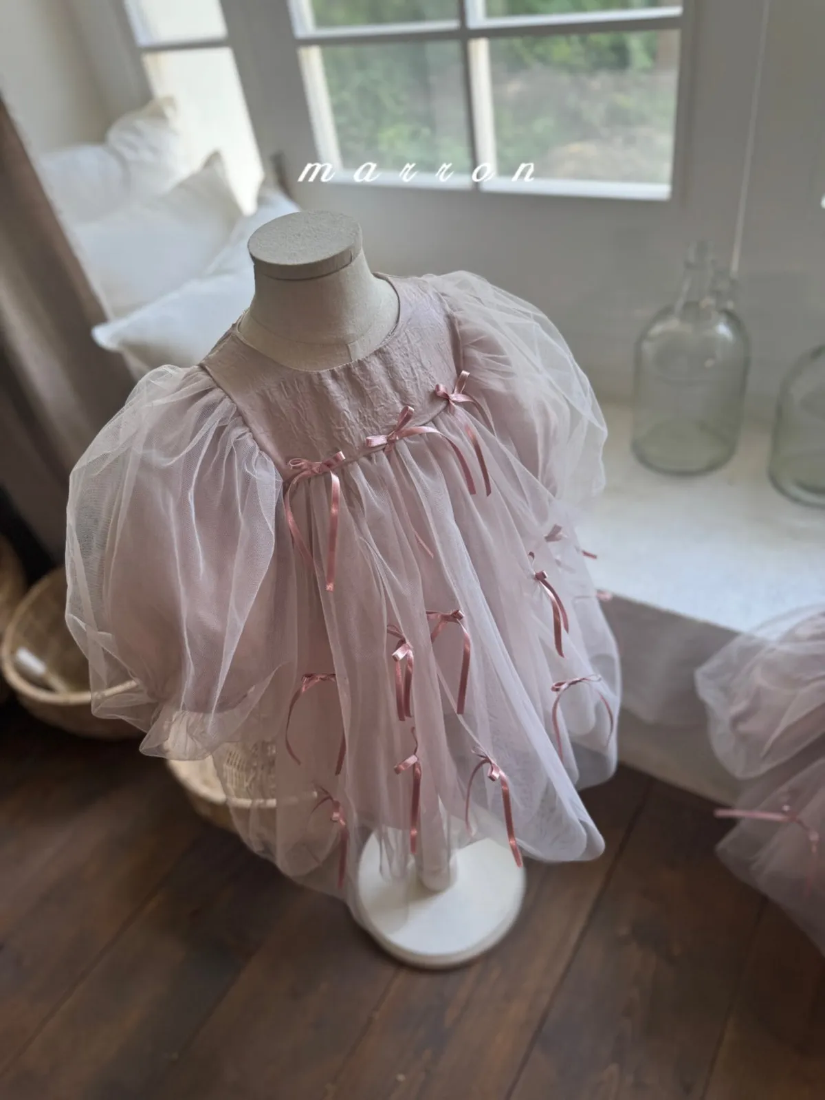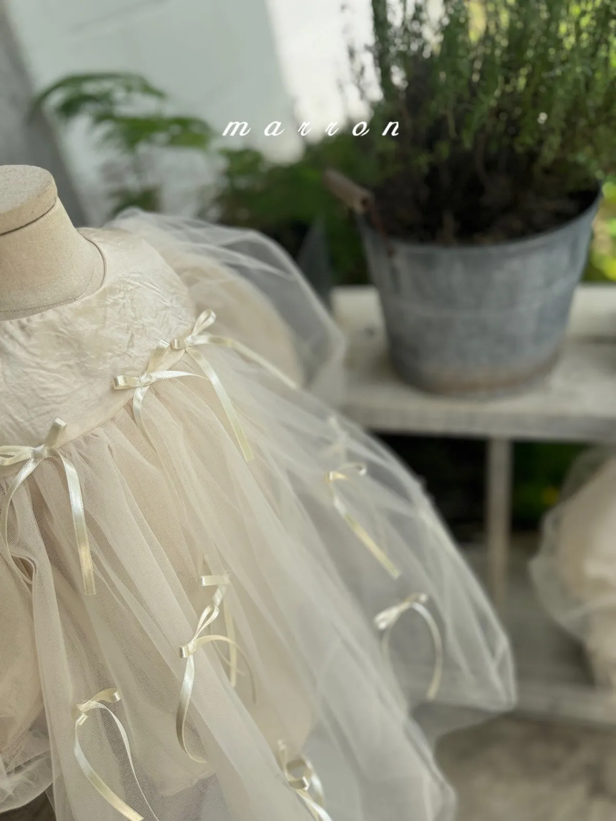 Marron 蝴蝶結澎澎袖連身紗裙
