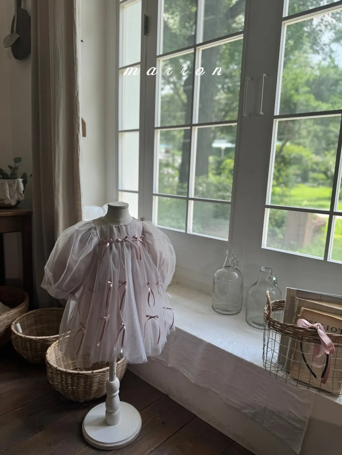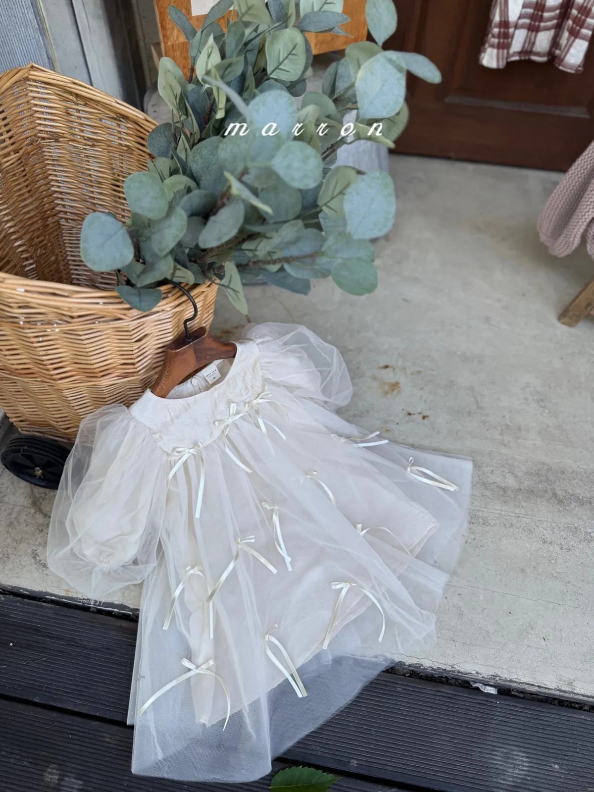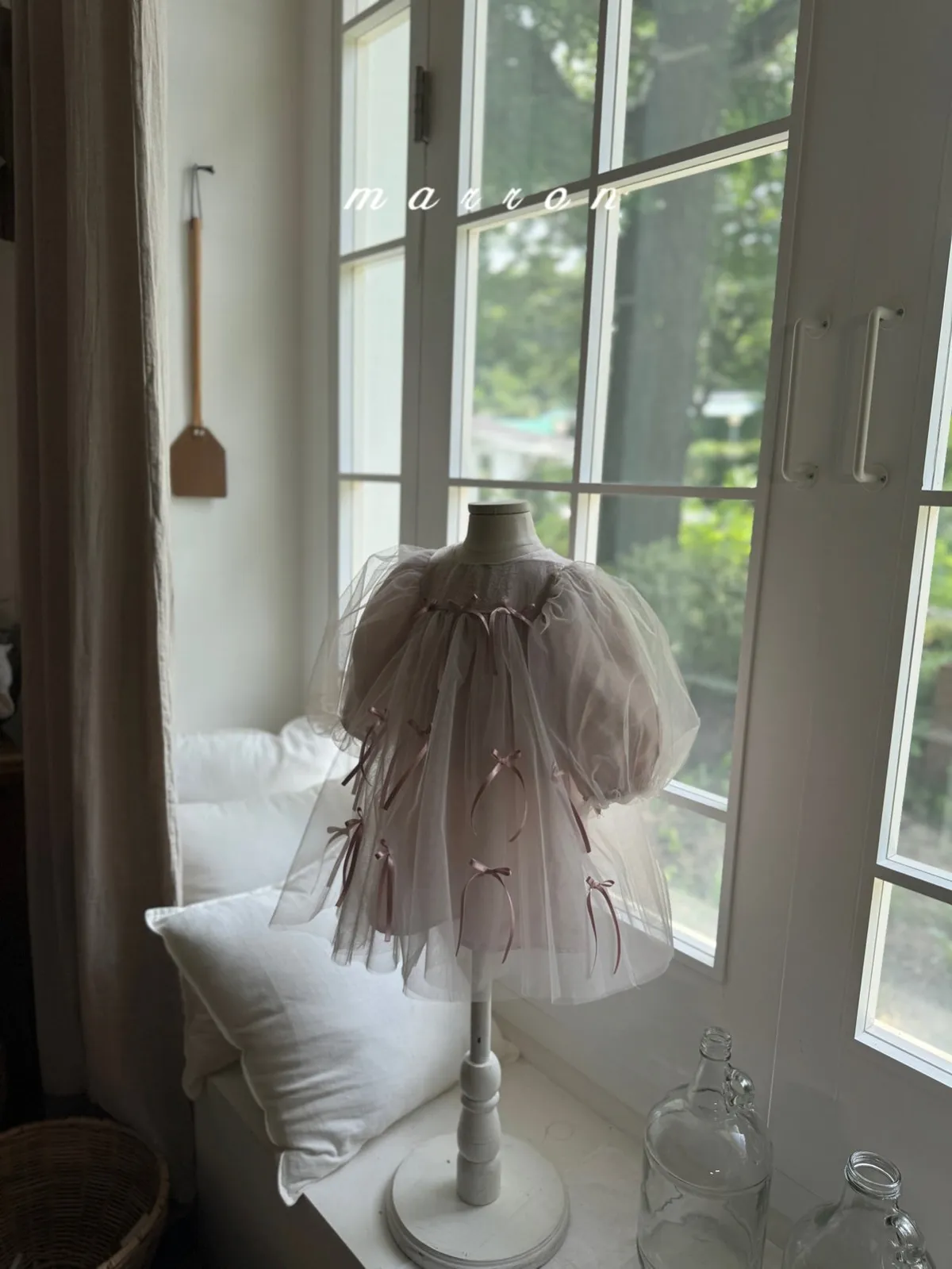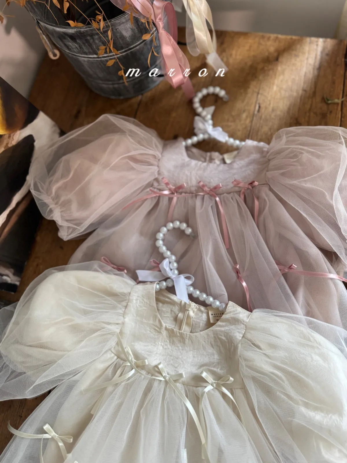 Marron 蝴蝶結澎澎袖連身紗裙