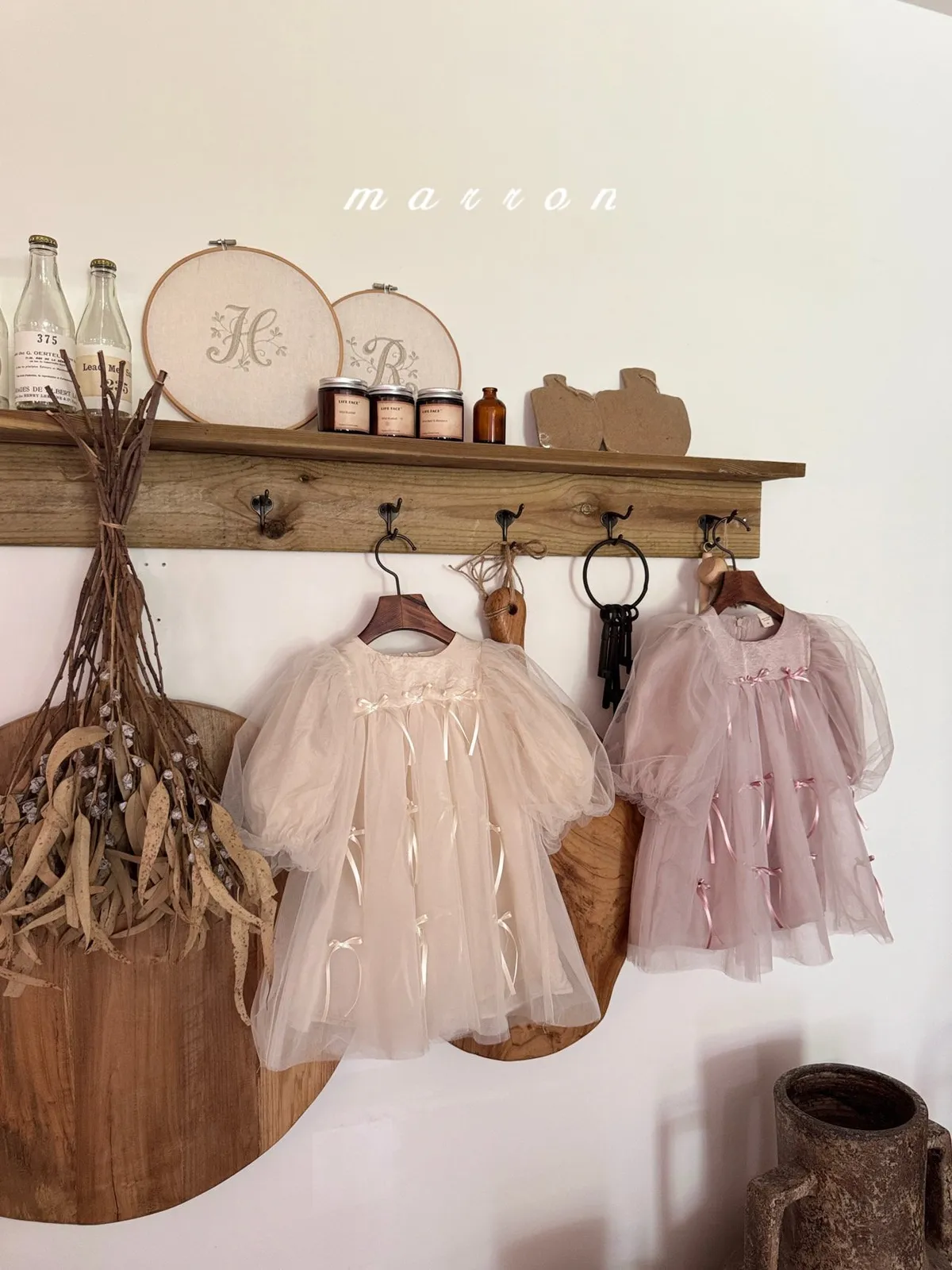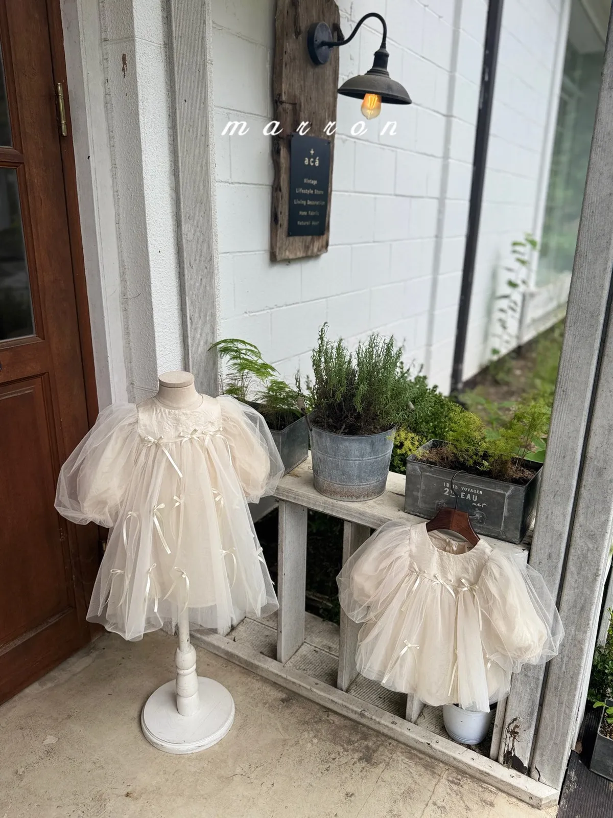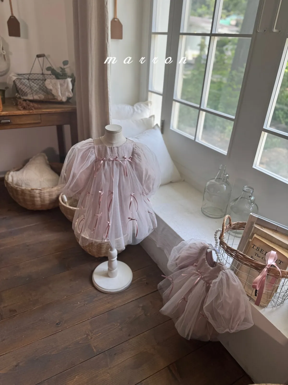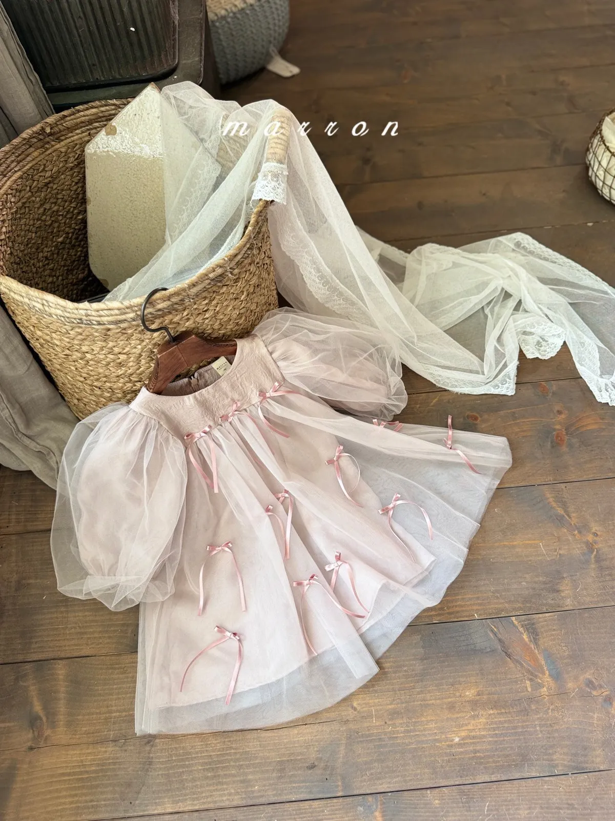 Marron 蝴蝶結澎澎袖連身紗裙