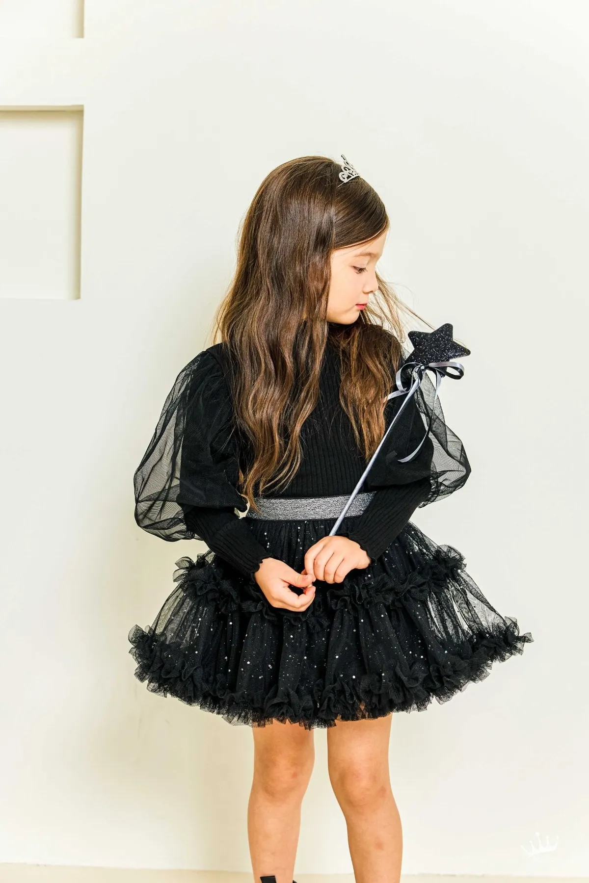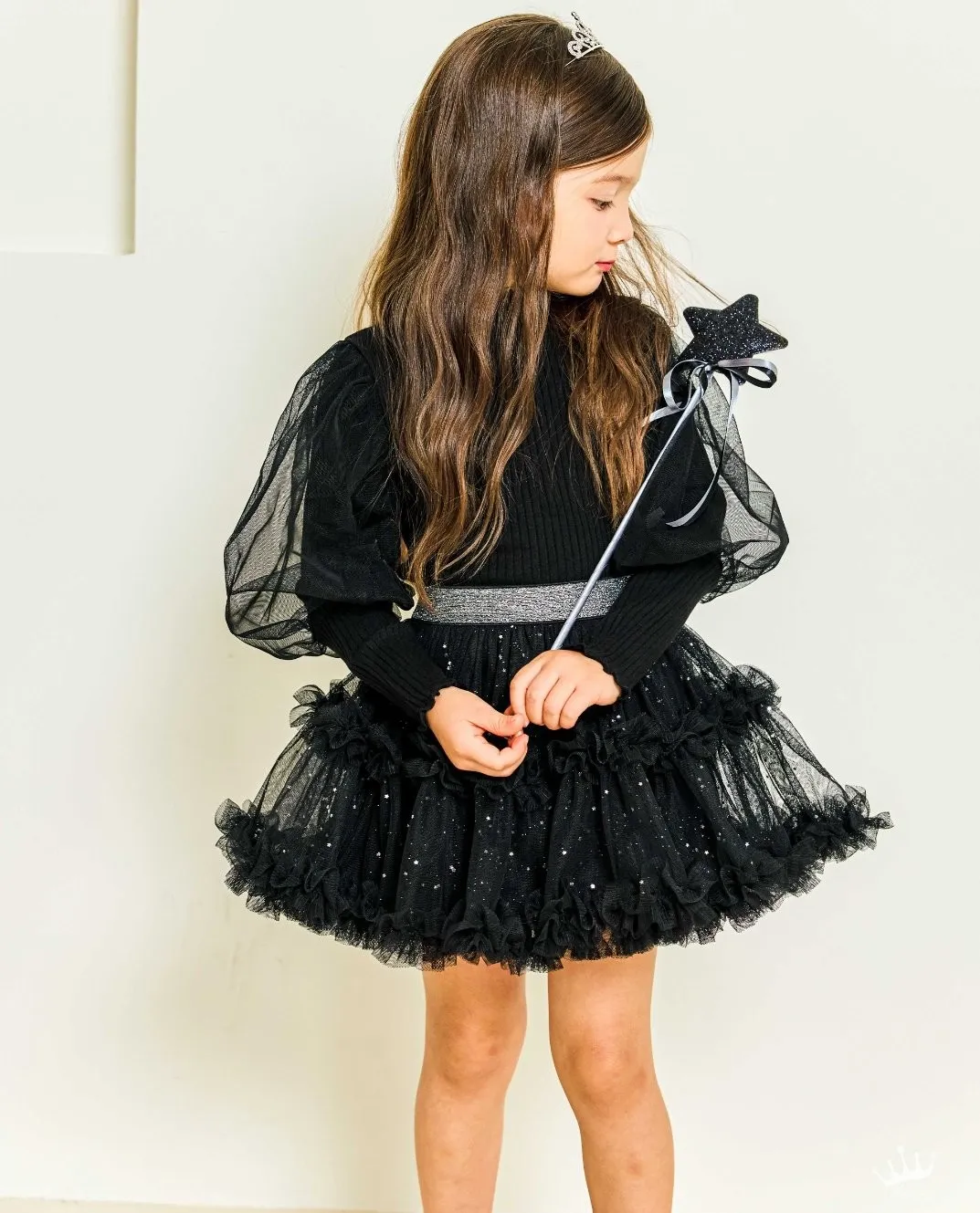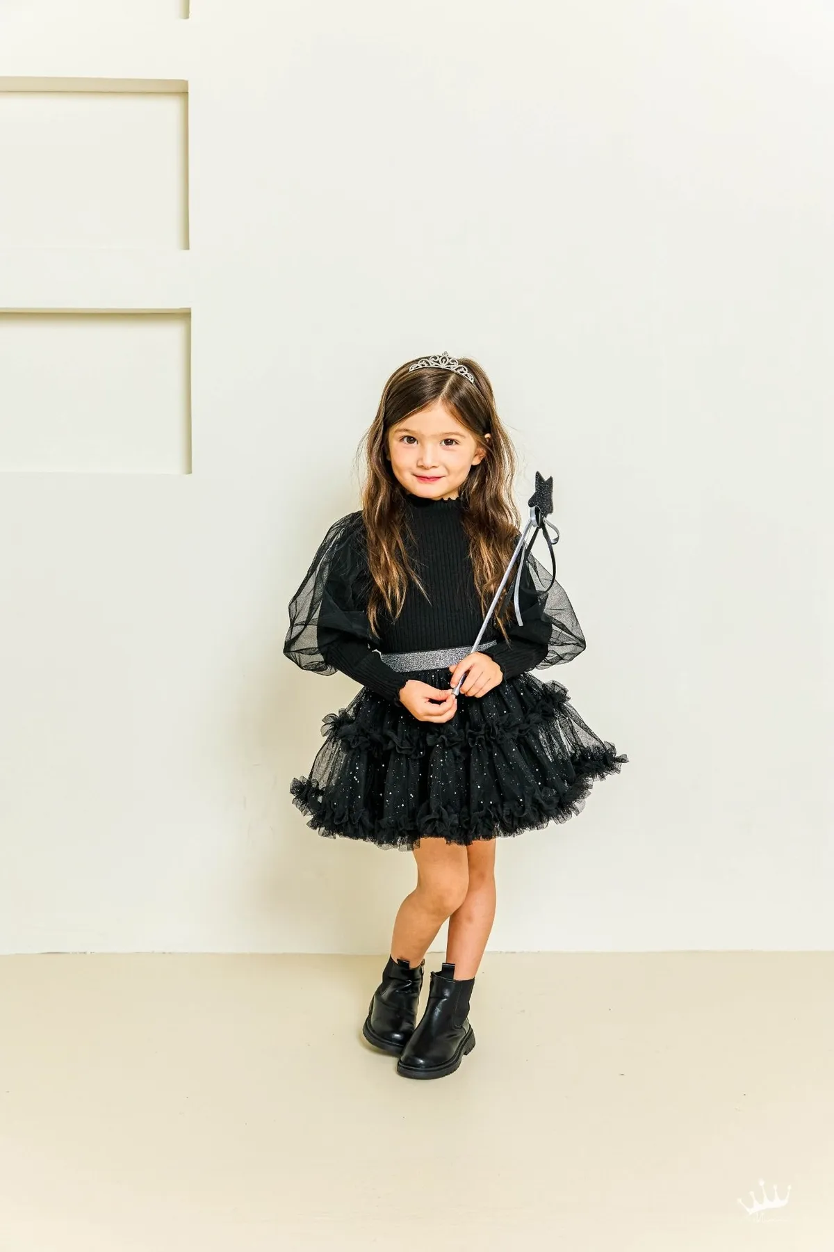 블랙 컬러에 블링블링 반짝이는 글리터 스커트는 걸음마다 별빛이 흩날리듯 반짝이며, 풍성한 프릴이 층층이 더해져 아이의 움직임에 따라 마치 춤추는 별빛을 보는 듯한 환상적인 무드를 만들어 줍니다.