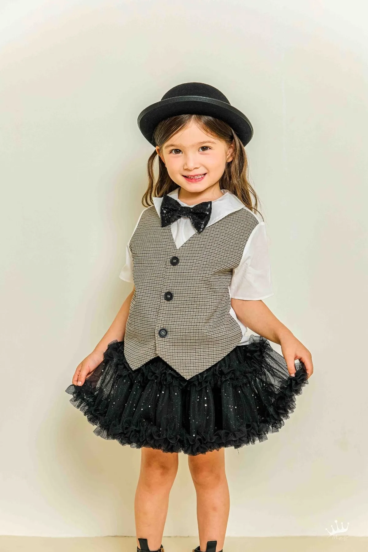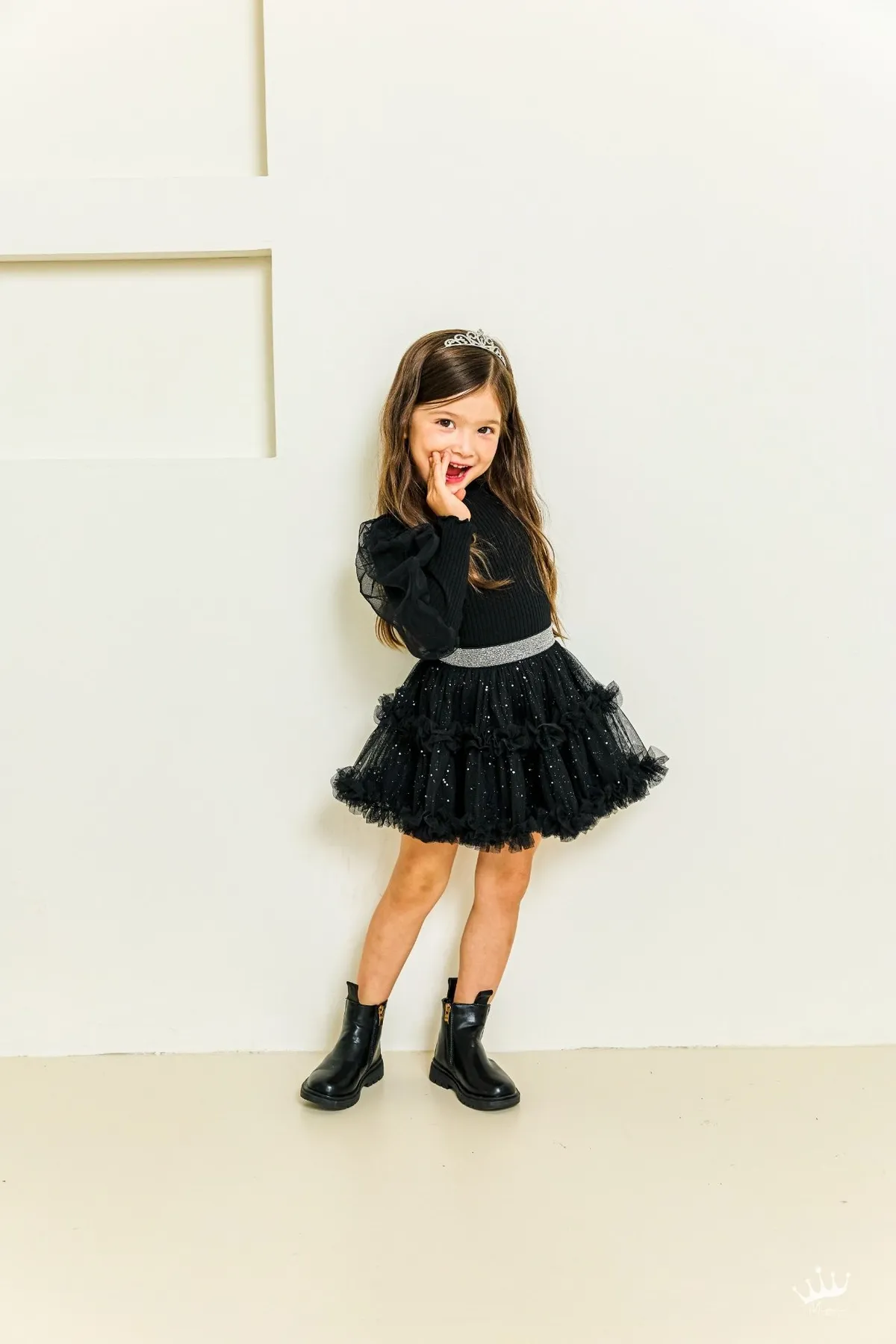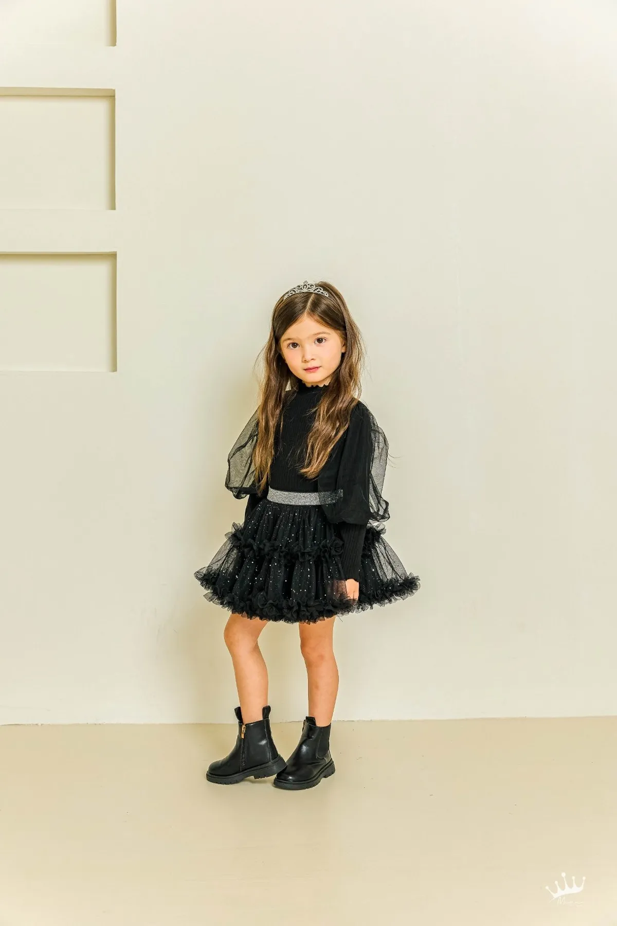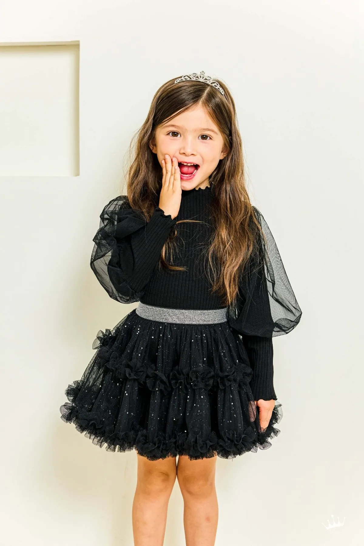 블랙 컬러에 블링블링 반짝이는 글리터 스커트는 걸음마다 별빛이 흩날리듯 반짝이며, 풍성한 프릴이 층층이 더해져 아이의 움직임에 따라 마치 춤추는 별빛을 보는 듯한 환상적인 무드를 만들어 줍니다.