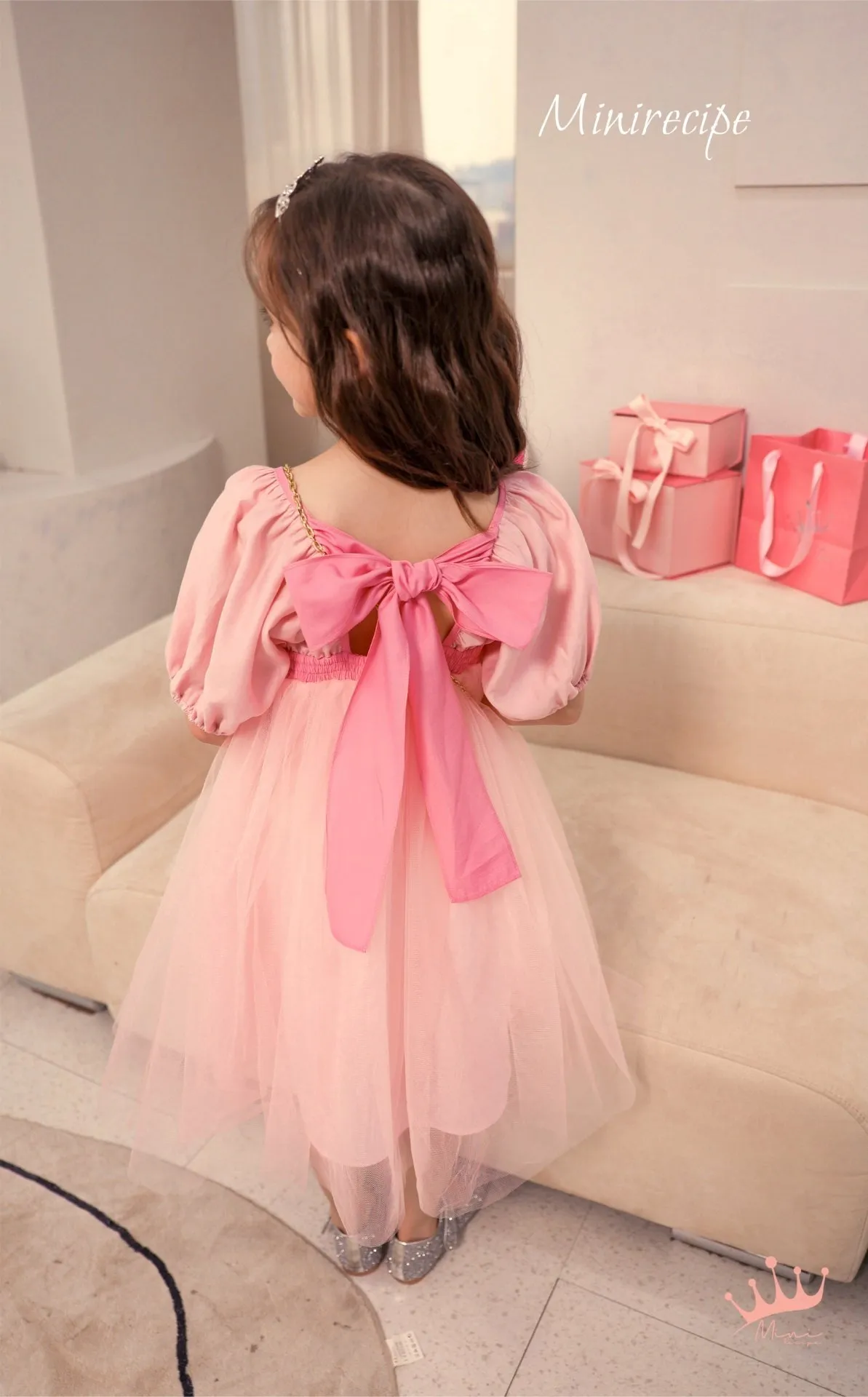 幹玫瑰滴滴落下的幹練的粉色和稚嫩的薄紗層,大大的粉色背石蝴蝶結是亮點